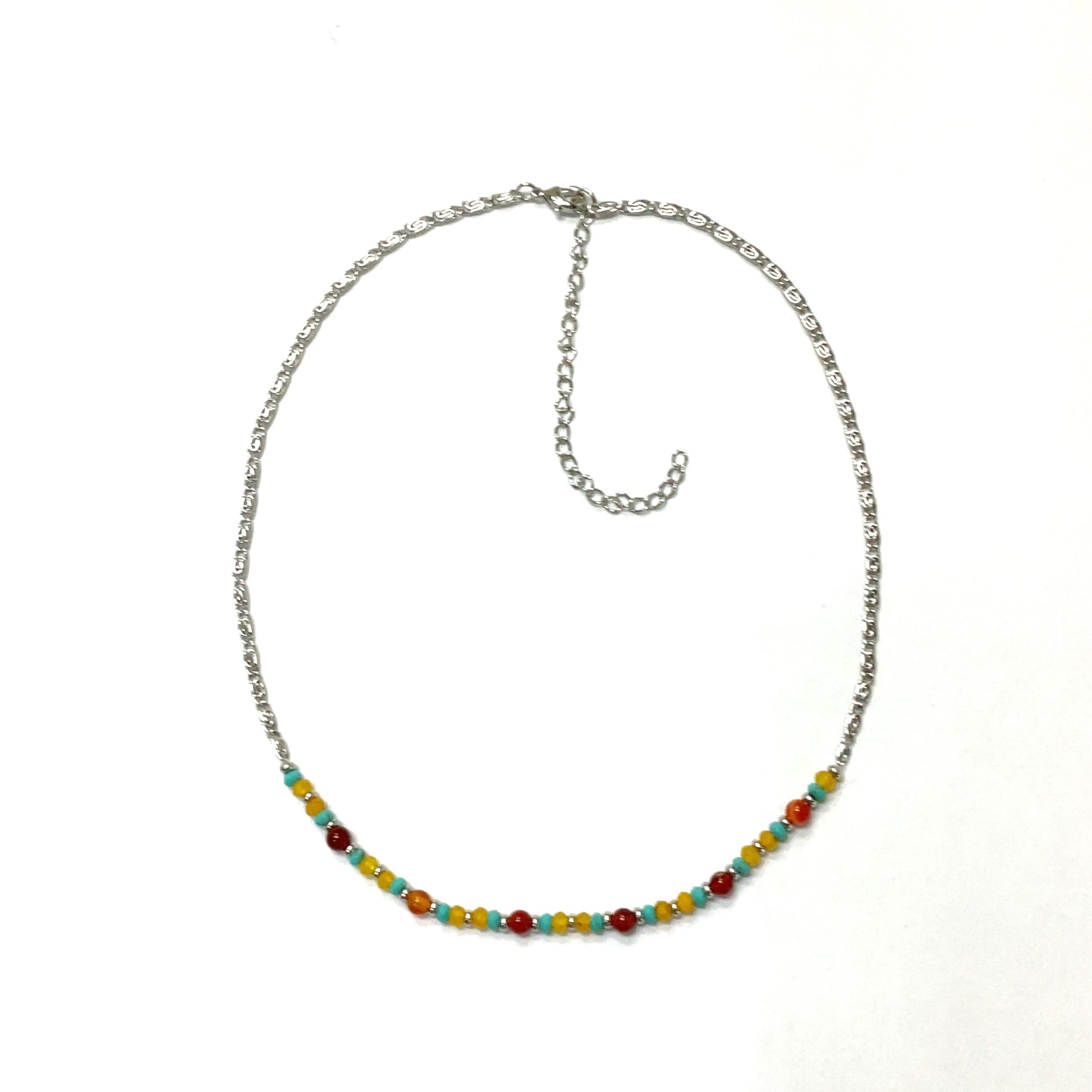 产品描述这条充满活力的波西米亚风项链,以纤细的银色链条为基底,点缀着五彩缤纷的天然小石珠。轻盈的设计和明快的色彩,让它无论是单戴还是叠戴,都能为你的夏日穿搭增添一抹随性的异域风情。
