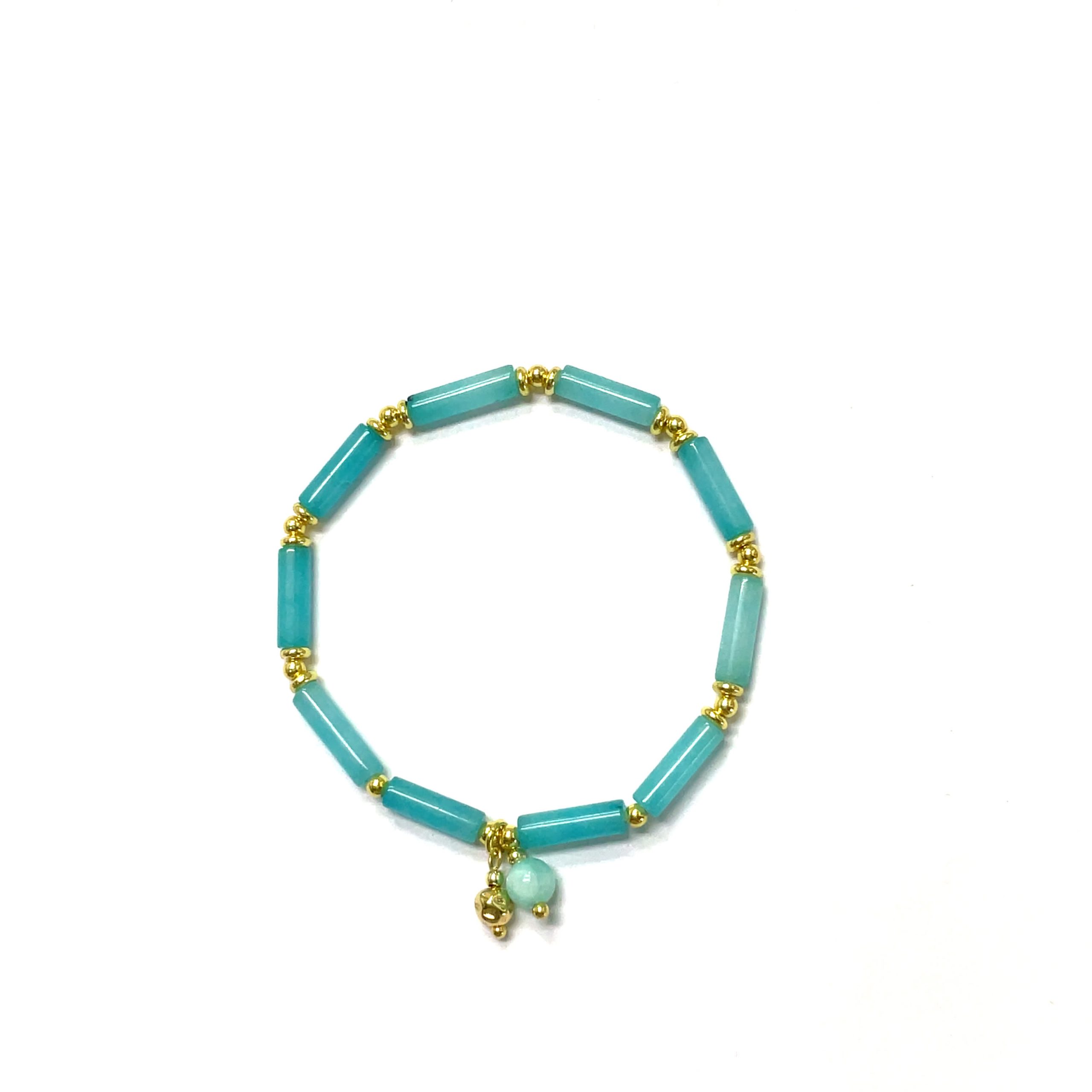 这款自带清凉感的天河石手链,由天然天河石柱形珠与镀金铜珠相间串成,坠着一颗圆润的天河石小吊坠。清新的湖水蓝调仿佛把夏日海风戴在手上,无论是搭配T恤还是连衣裙,都能为你的造型注入一抹清爽活力。
